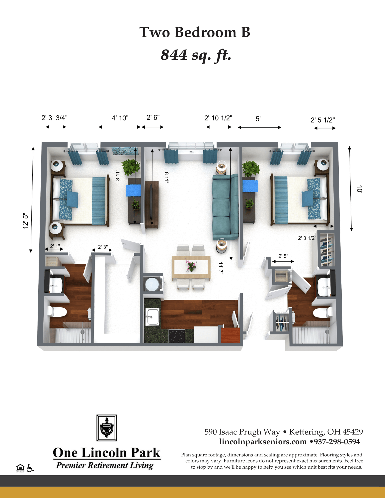 Each of our two-bedroom apartments is spacious, with three distinctive floor plans catering to varied preferences. The two-bedroom standard east wing, spanning 844 square feet, offers a well-balanced layout that ensures comfort and functionality for its residents. In the two-bedroom west wing unit, which measures 789 square feet, residents enjoy the added convenience of walk-in closets. These floor plans also provide individual bathrooms for each resident, improving their privacy.